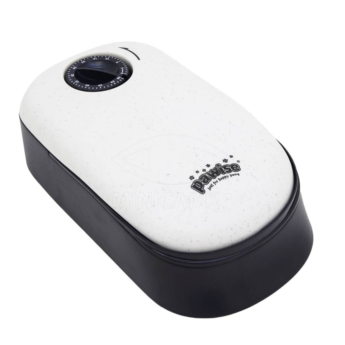 Автоматическая кормушка из черного пластика. Рассчитана на одноразовое кормление по установленному времени. Максимальный период таймера составляет 48 часов. По истечении заданного времени крышка, закрывающая емкость с кормом, откидывается вверх на пружинке и открывает доступ к пище. Емкость лотка - 300 мл. Для питания автокормушки используется одна батарейка формата АА.